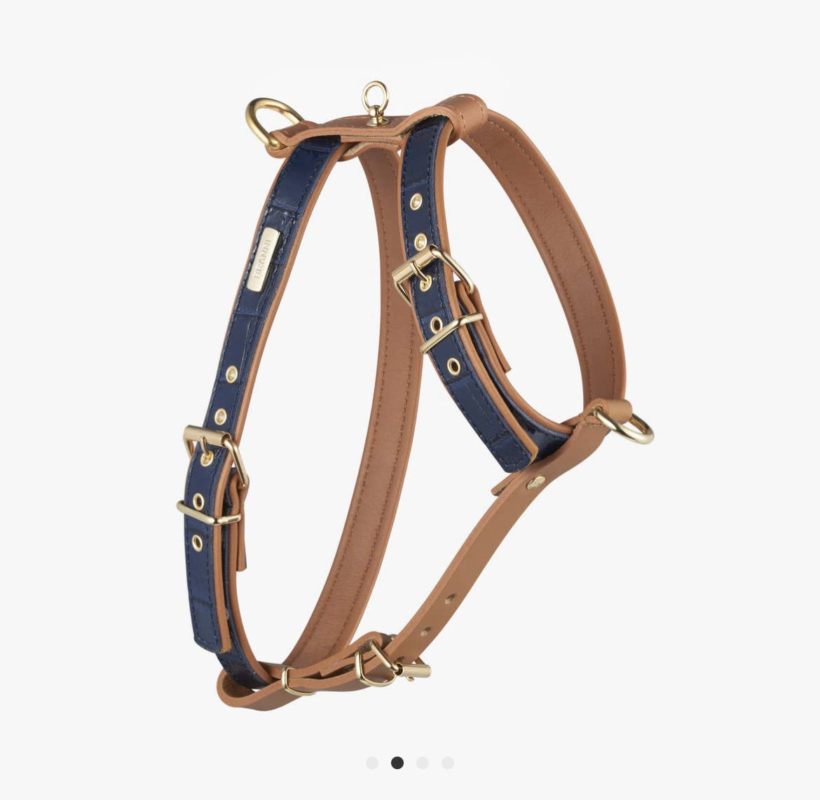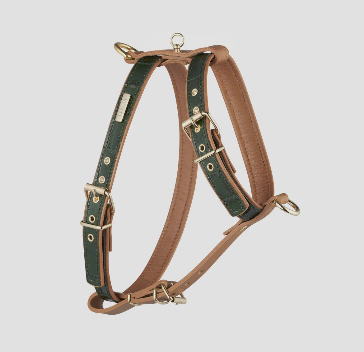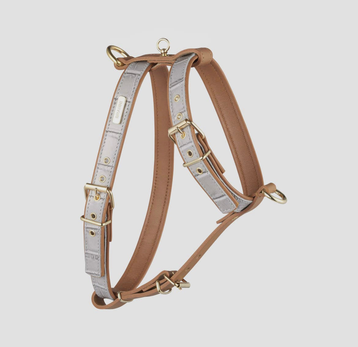 Pettorina per cani elegante e sofisticata in pelle con stampa coccodrillo. Fodera in pelle bovina extra morbida (entrambi di altissima qualità). Un classico reinventato, un accessorio indispensabile per chi preferisce la pettorina per lunghe passeggiate insieme. Raccordi in ferro con finiture oro. Anello posteriore sulle croce e anello frontale sul petto. Regolabile su collo, torace e petto (5 fori di margine) con sistema di chiusura a fibbia classica.