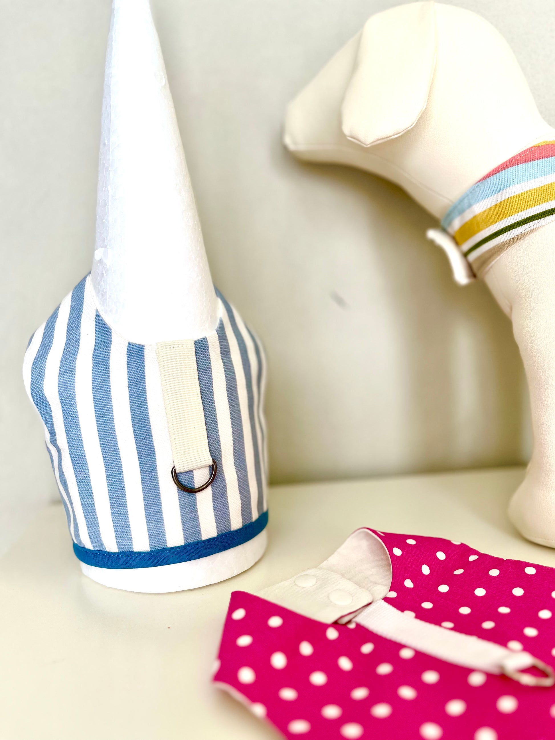 Questa pettorina è un vero omaggio all’estate, ispirata ai colori e all’eleganza senza tempo delle località costiere italiane. Le righe verticali nei toni del bianco, azzurro e blu richiamano lo stile marinaro classico, sempre attuale e chic. Rifinita con bordatura blu e bottoni automatici in tinta, è leggera e comoda, perfetta per le passeggiate estive. Il tessuto è fresco ma resistente, con un anello a D centrale in metallo per attaccare il guinzaglio in modo sicuro.