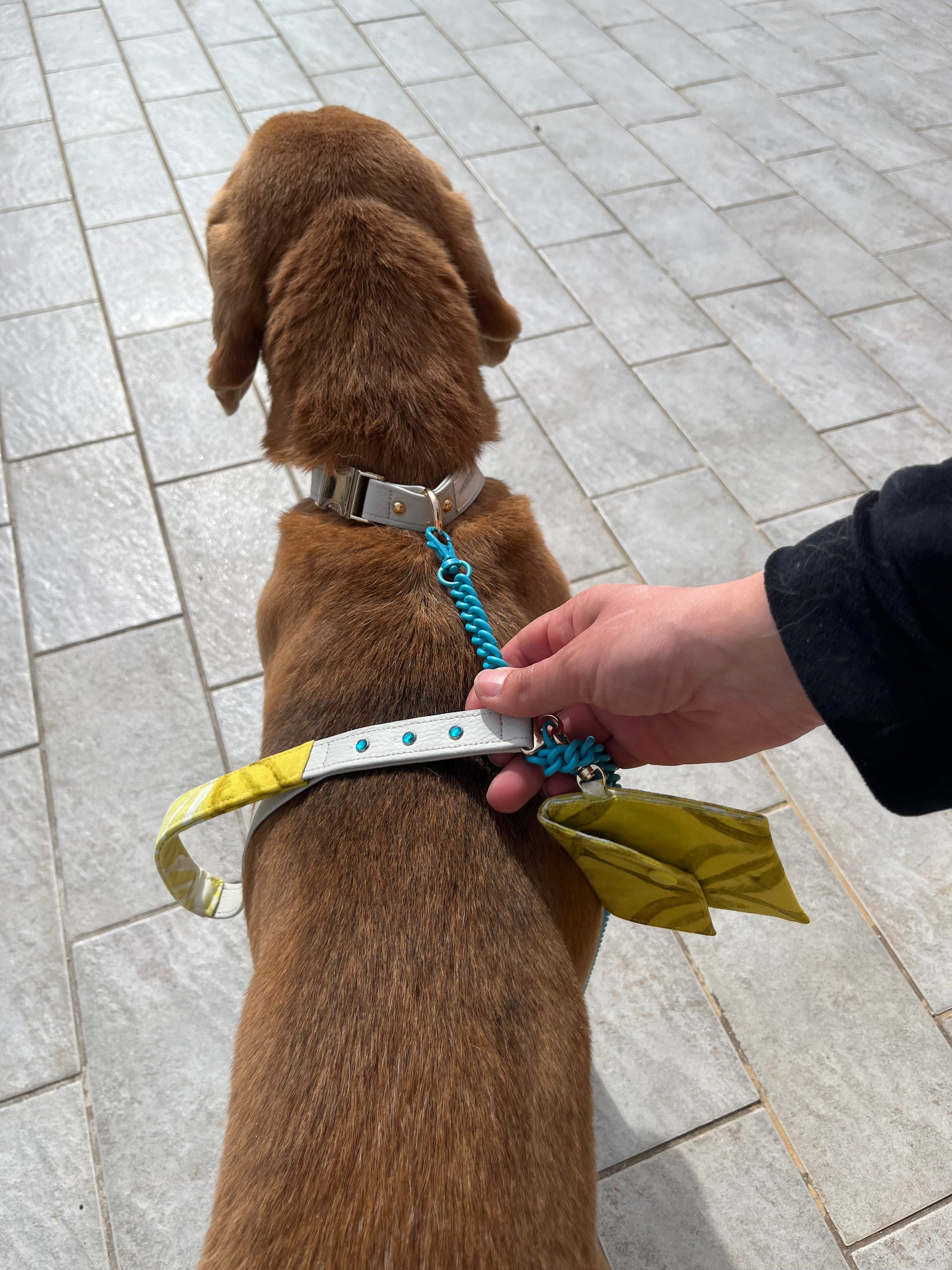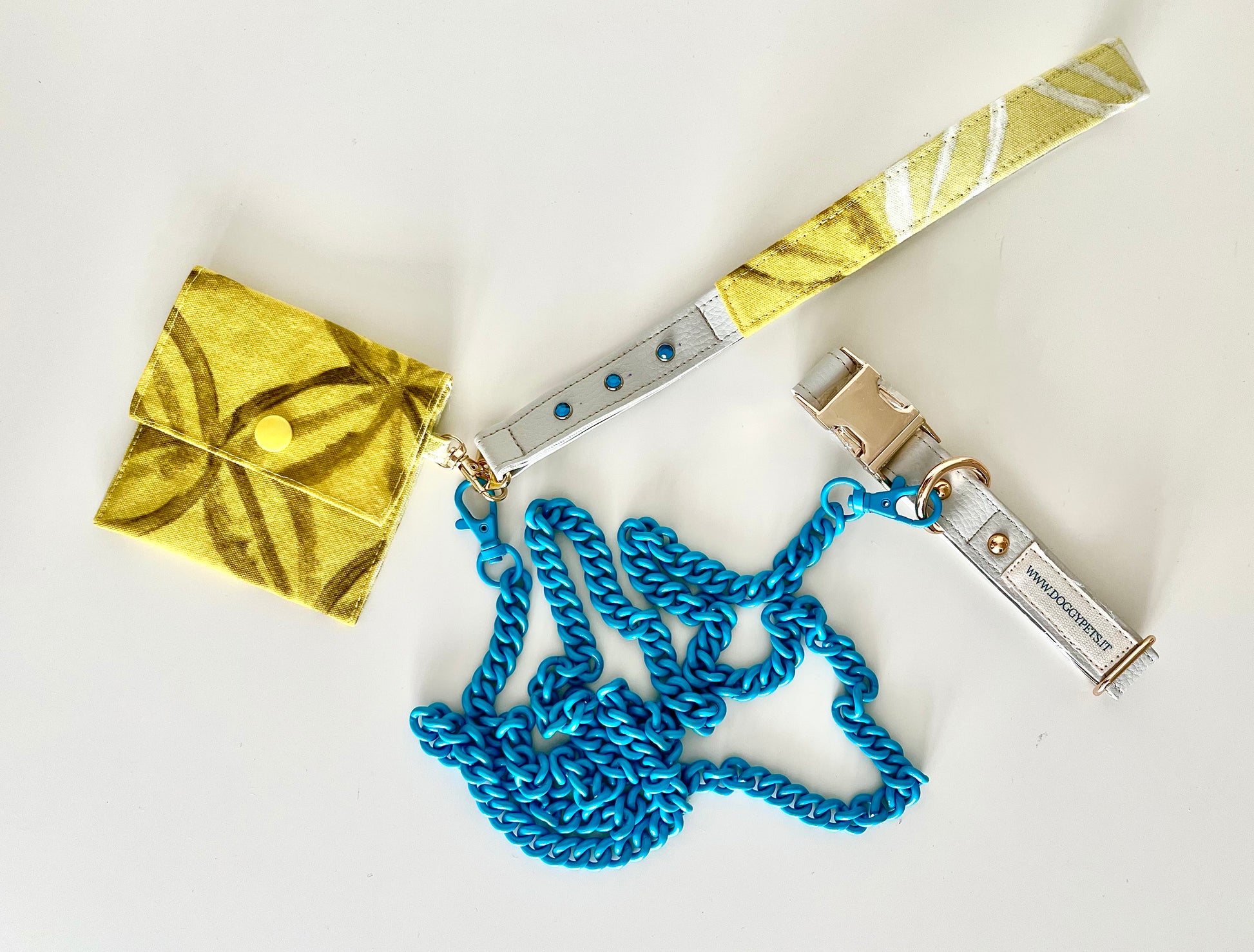 Vivi avventure mozzafiato con il Set da Passeggio LIME! Realizzato in similpelle e cotone, con catena e decorazioni turchese e giallo, questo set ti offrirà il massimo comfort e stile durante le tue passeggiate. Non lasciartelo sfuggire, prendi la tua libertà e osa con il LIME!