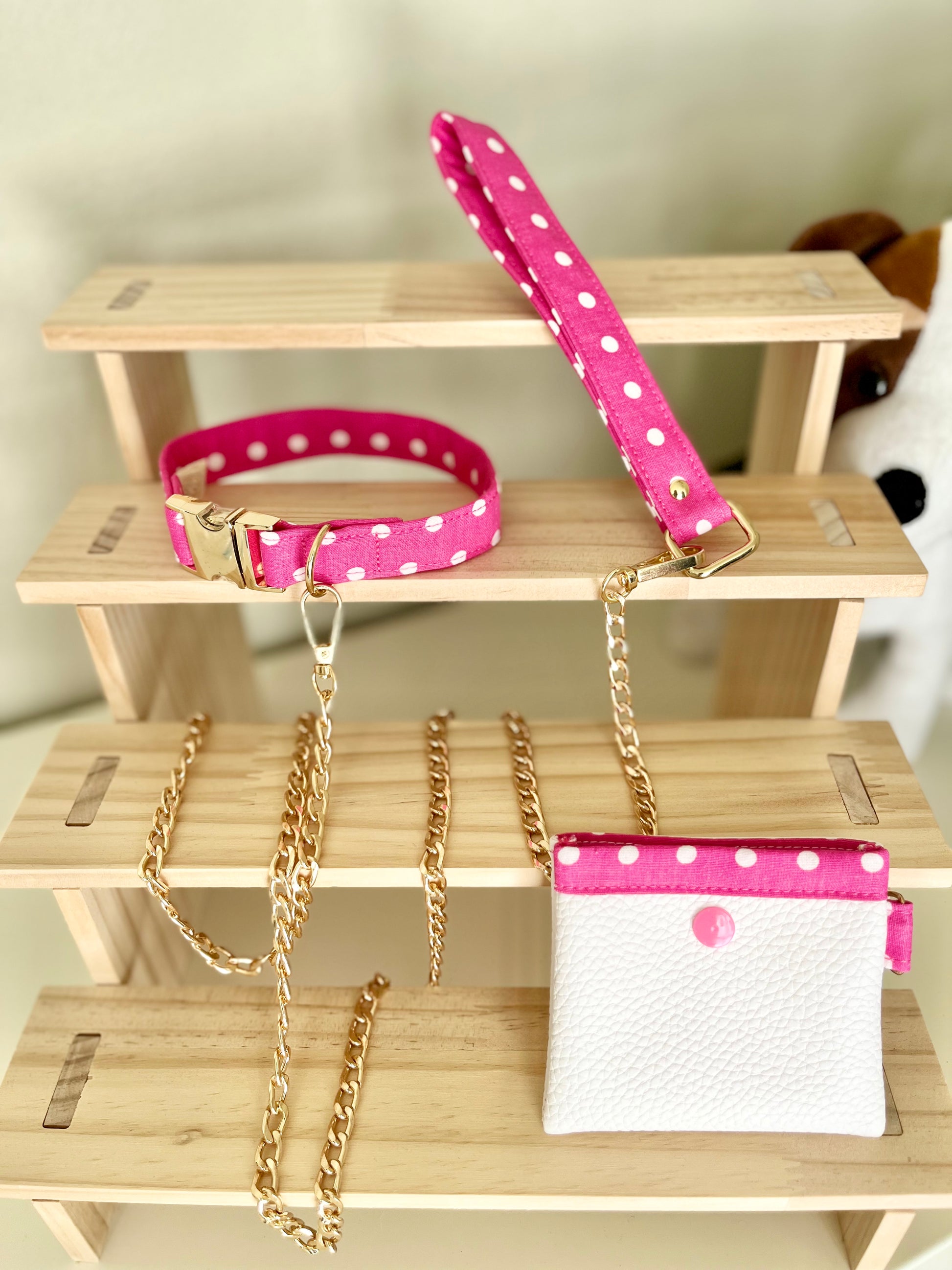 Una passeggiata elegante non passa mai inosservata. Questo set esclusivo unisce il fascino dei pois al glamour della catena dorata. Il collare e il manico del guinzaglio sono in cotone fuxia a pois bianchi, mentre il guinzaglio vero e proprio è realizzato con una catena oro super luminosa e resistente. In abbinato, la poopbag in similpelle bianca con bottone e bordo in cotone fucsia pois completa il look con un tocco di grazia.