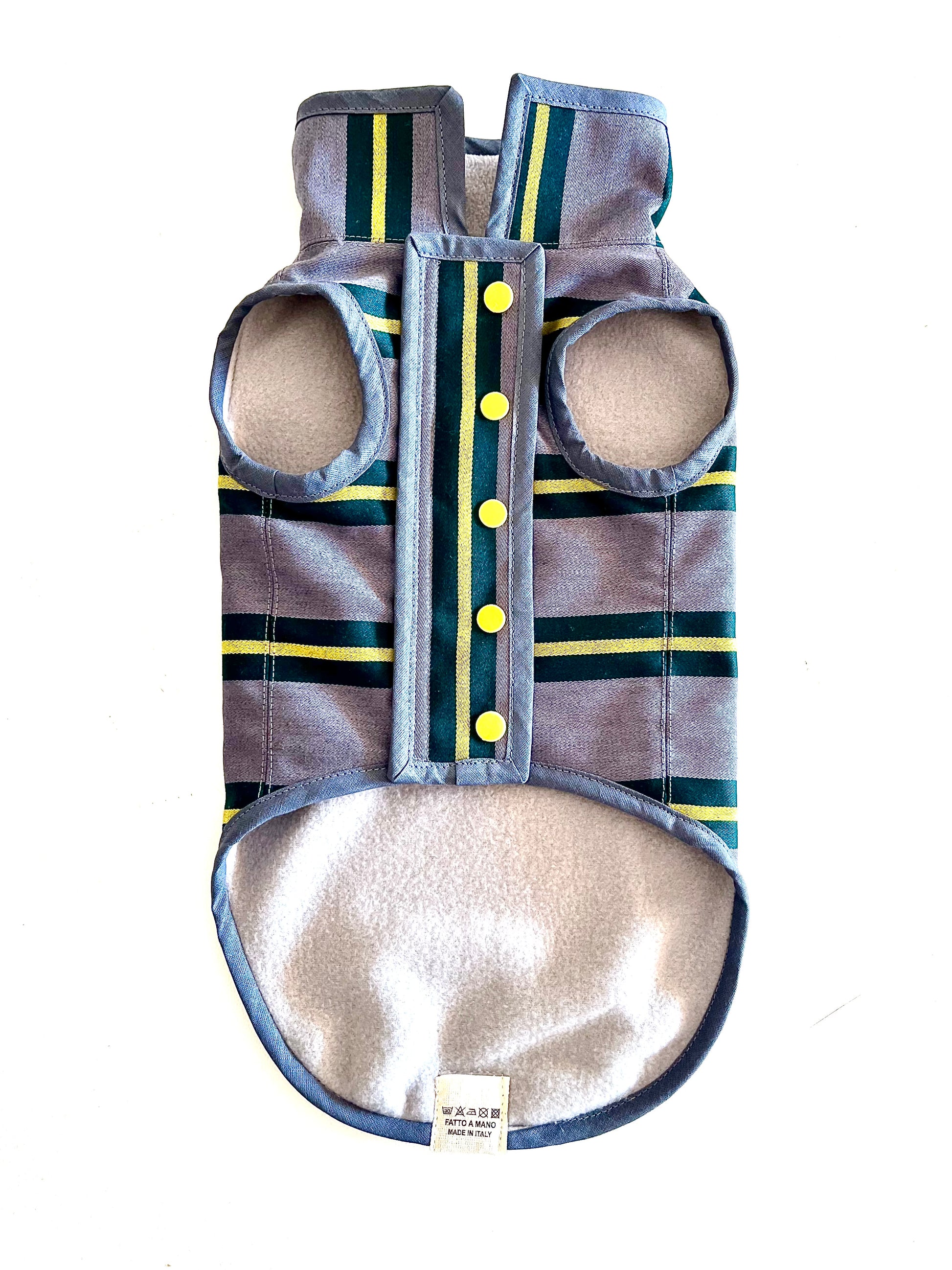 Il maglione Urban Stripe Warm è realizzato con interno in pile grigio caldo e morbido e esterno in cotone con fantasia a righe verde e giallo, perfetto per affrontare le giornate più fredde con un tocco di eleganza casual.