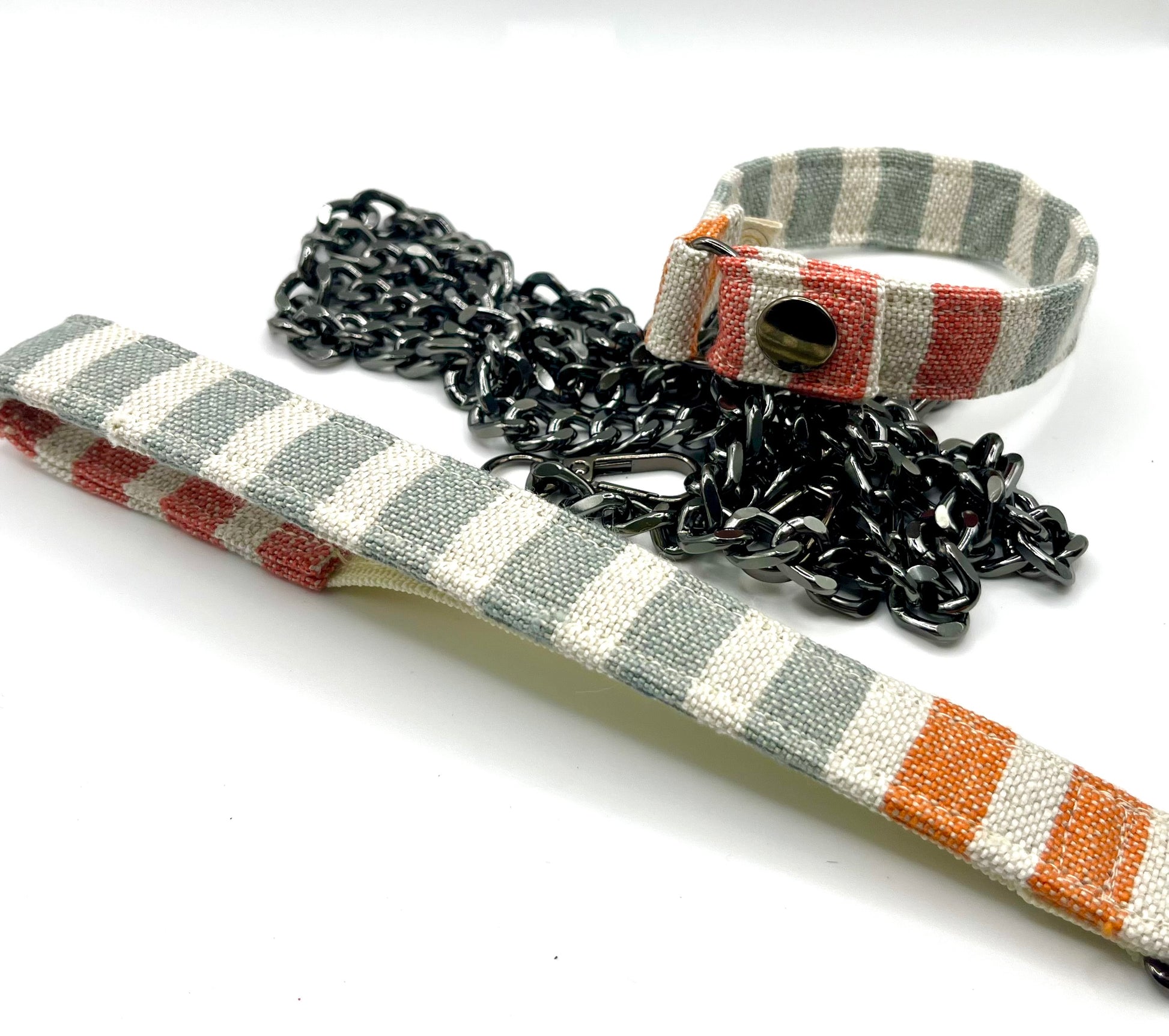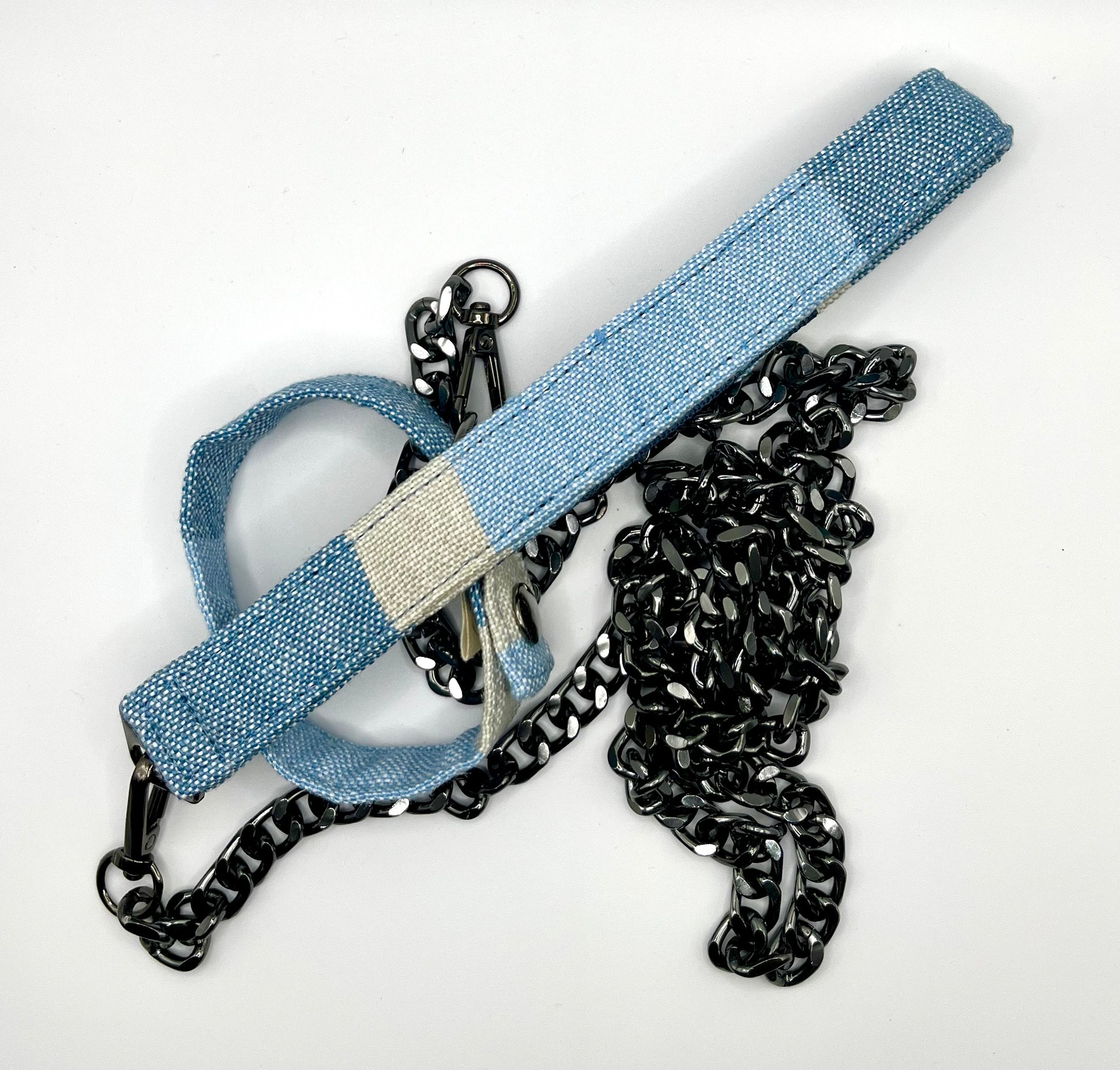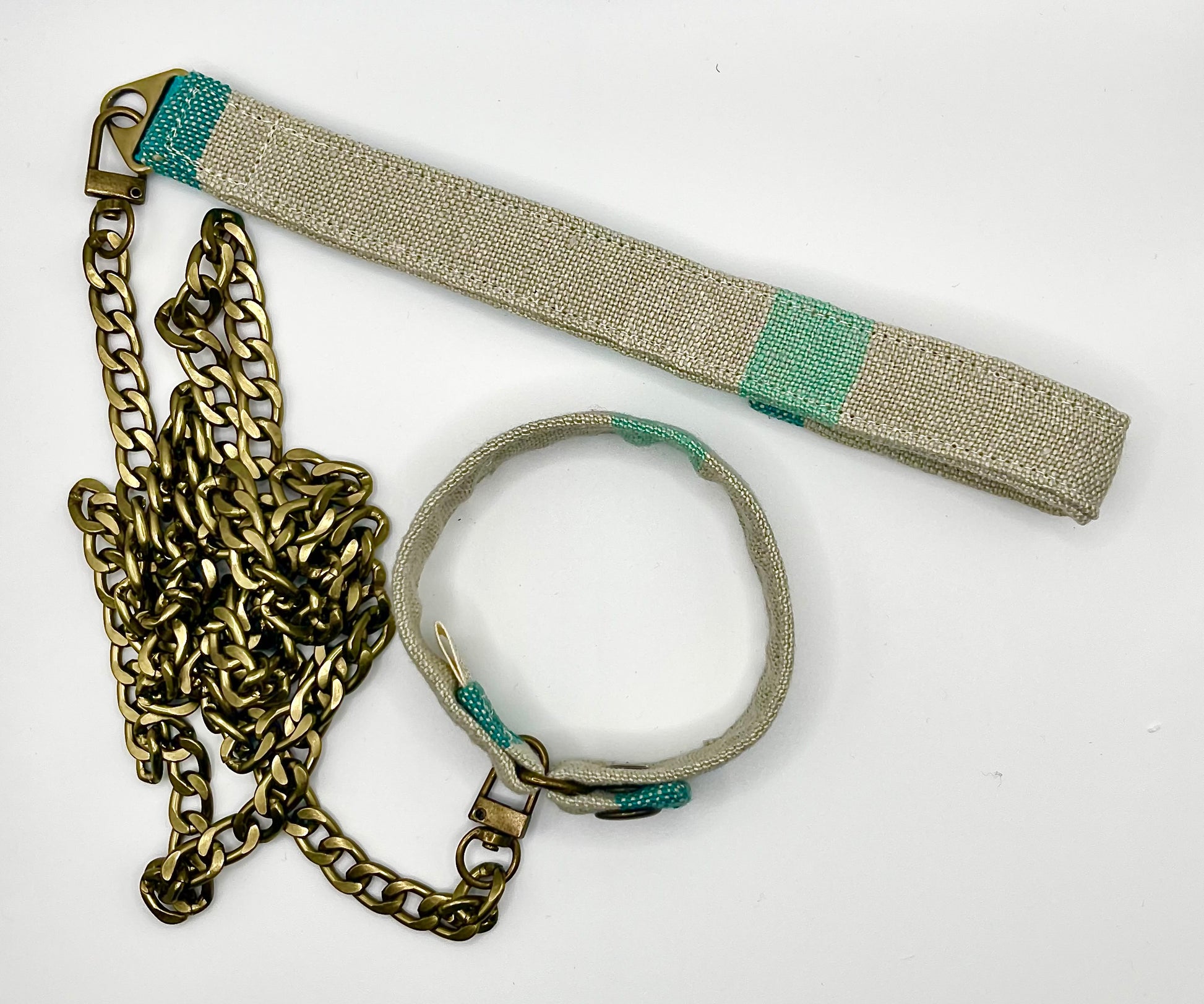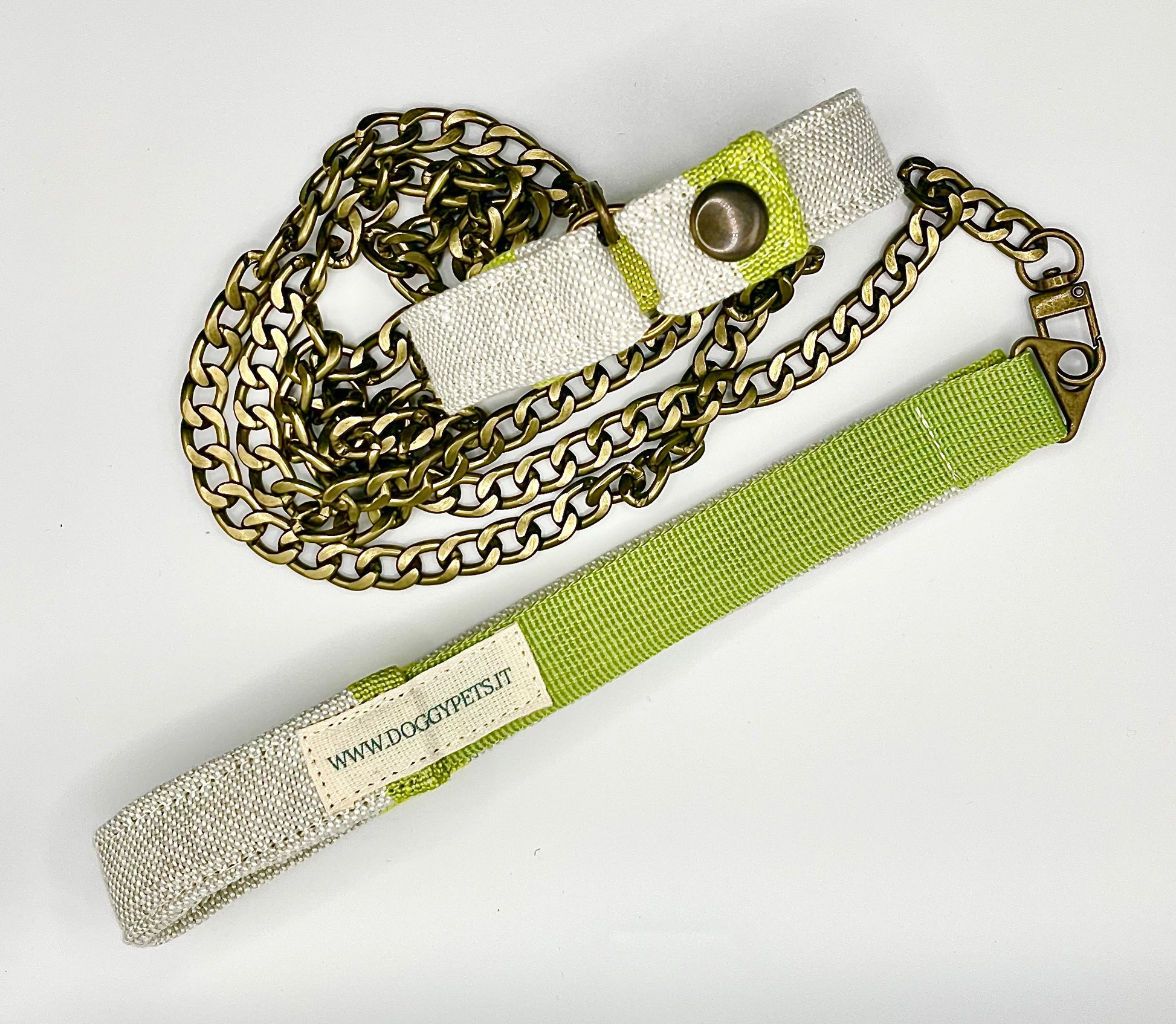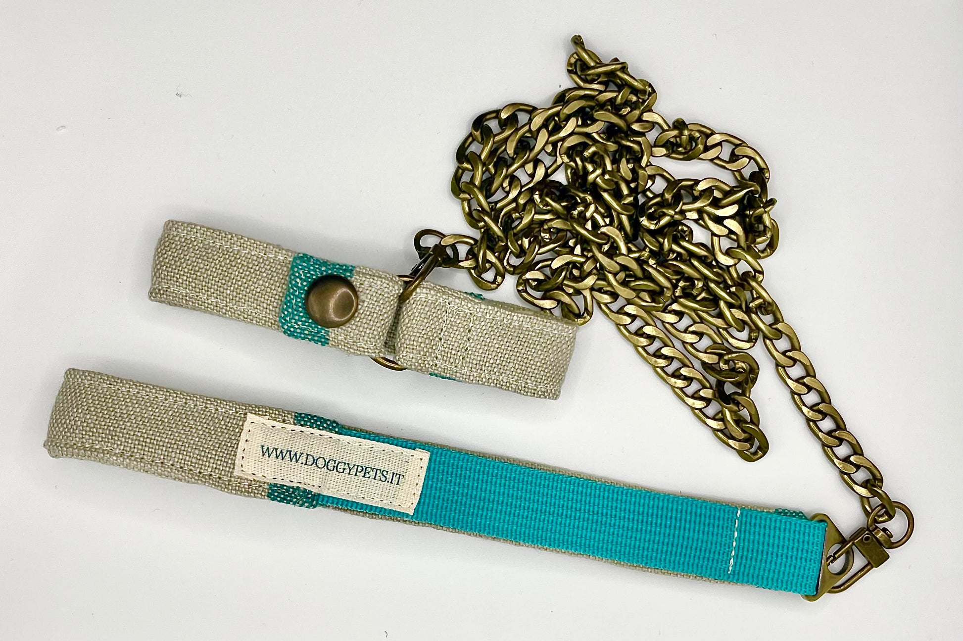🐾 Guinzaglio coordinato con mamico in lino abbinato al collare e la lunghezza in catena metallica (leggera ma resistente), per una presa sicura e uno stile ricercato.