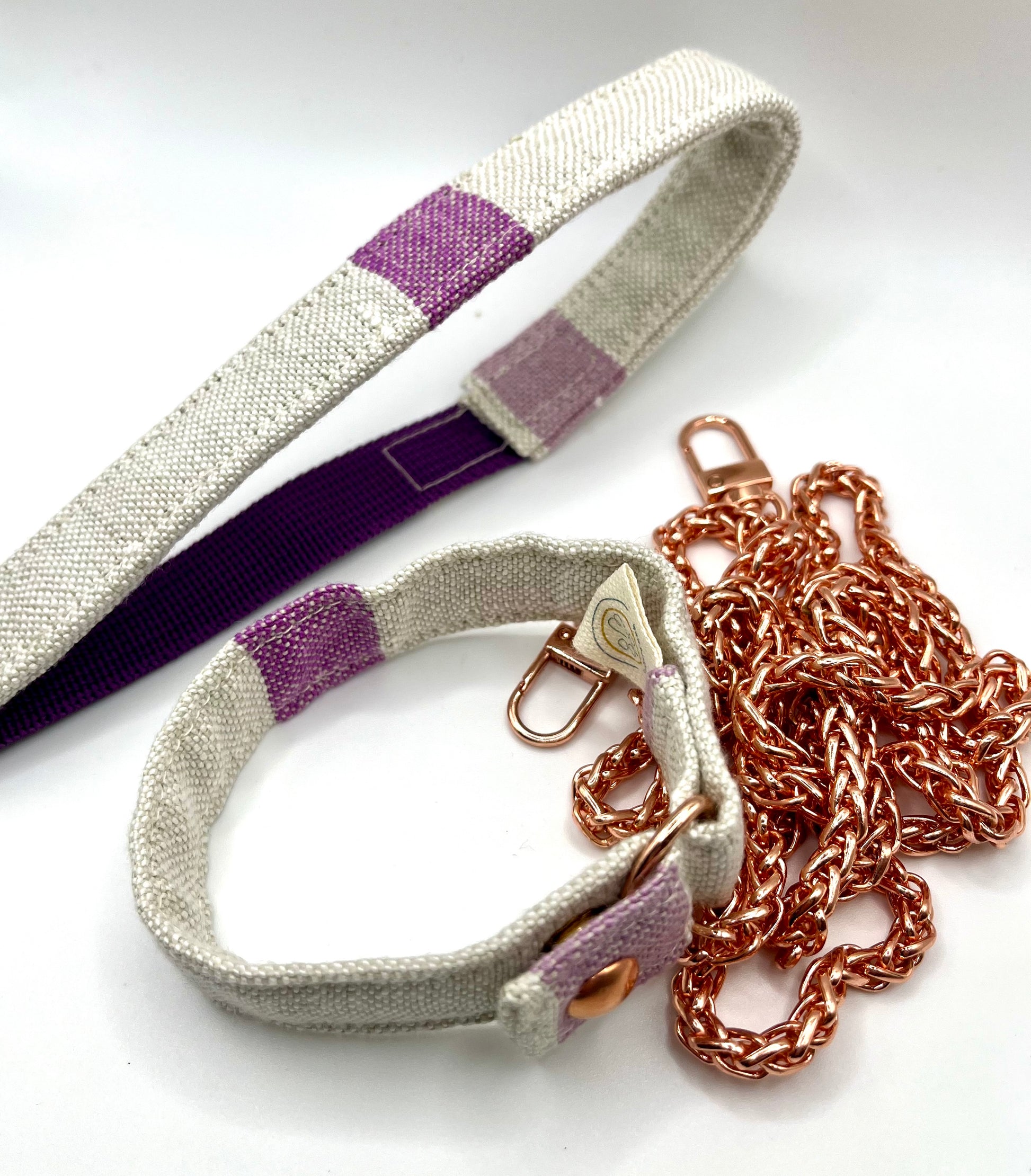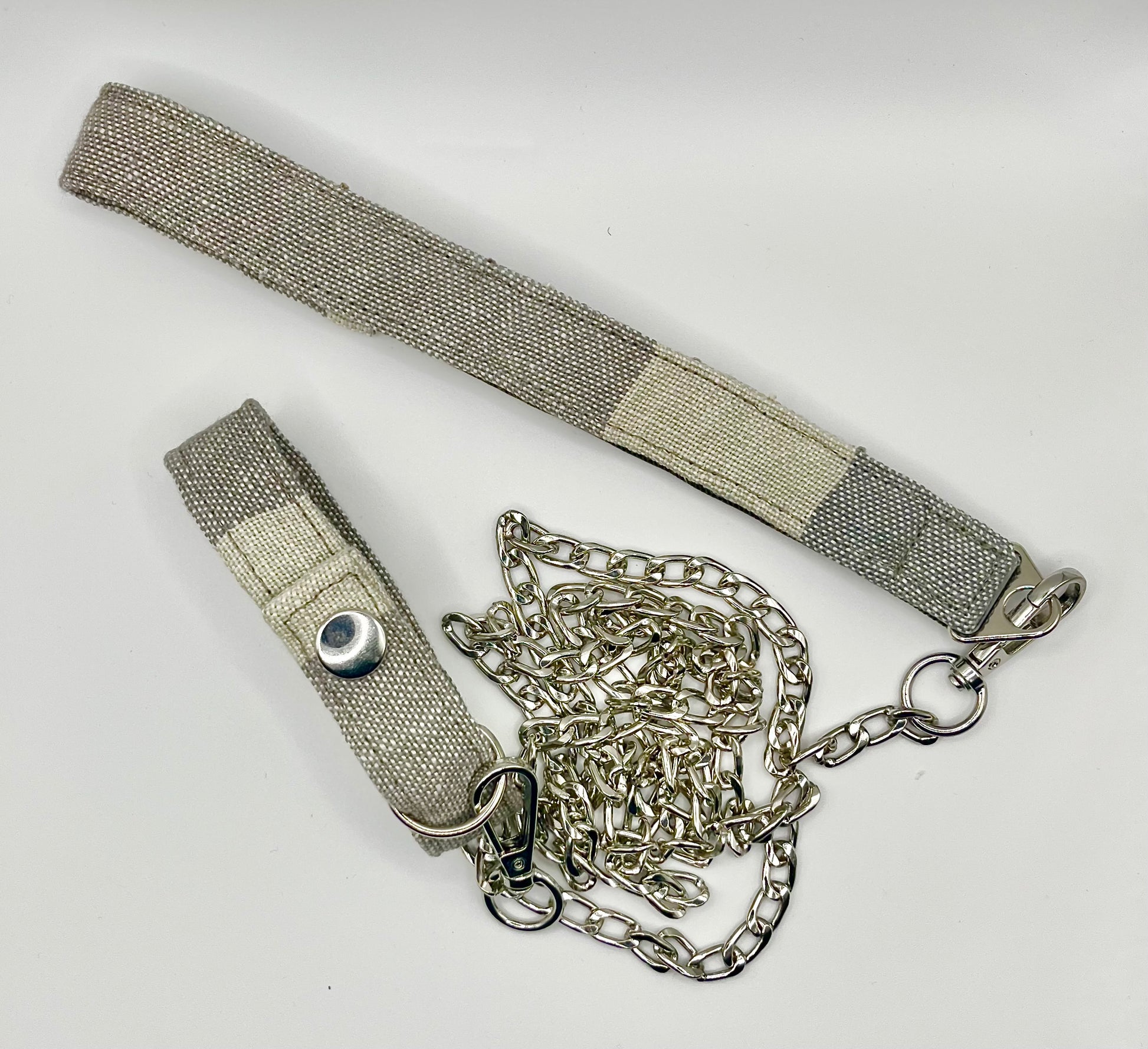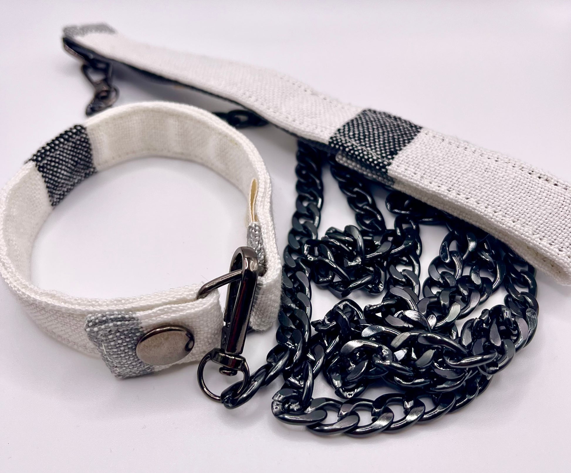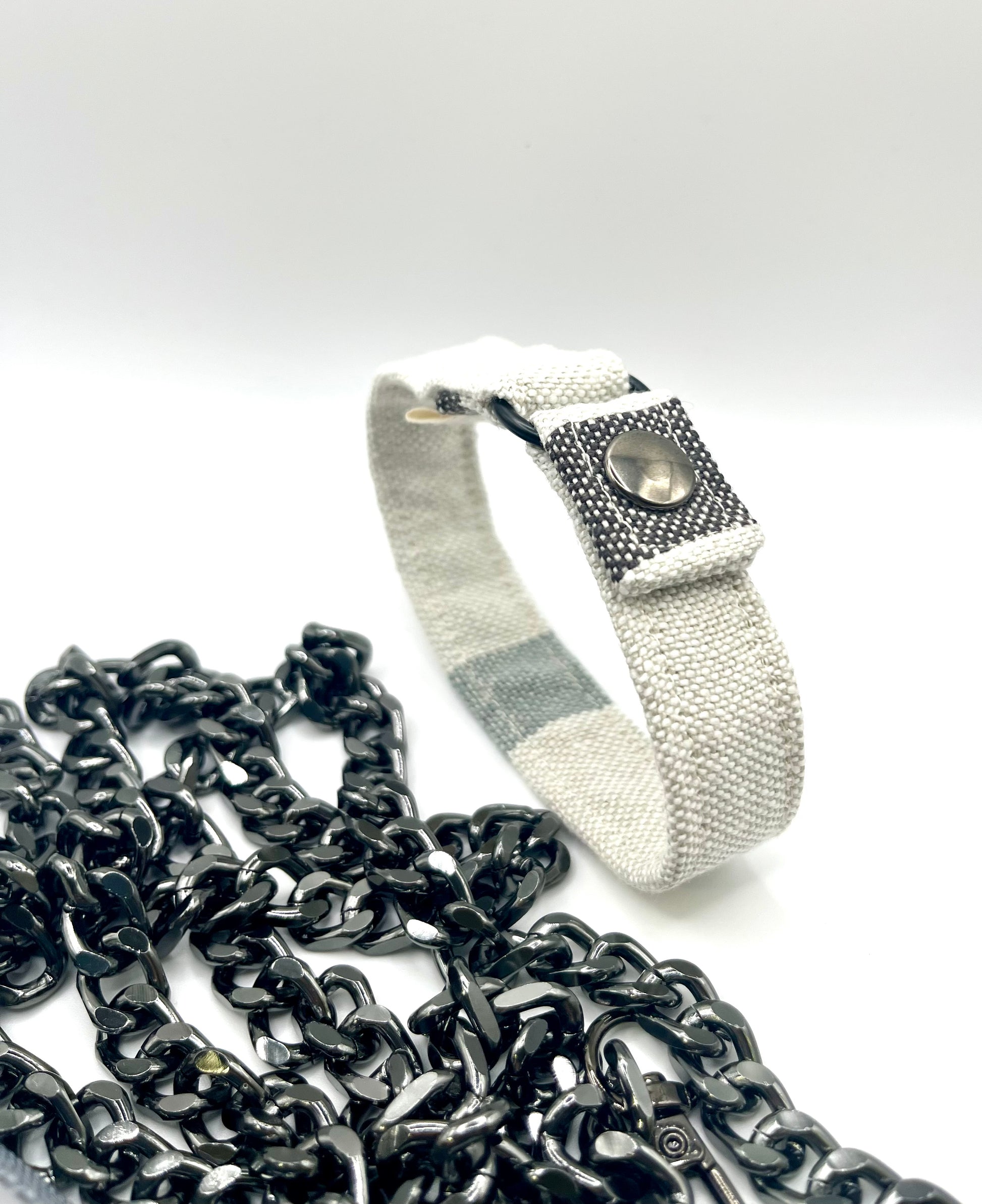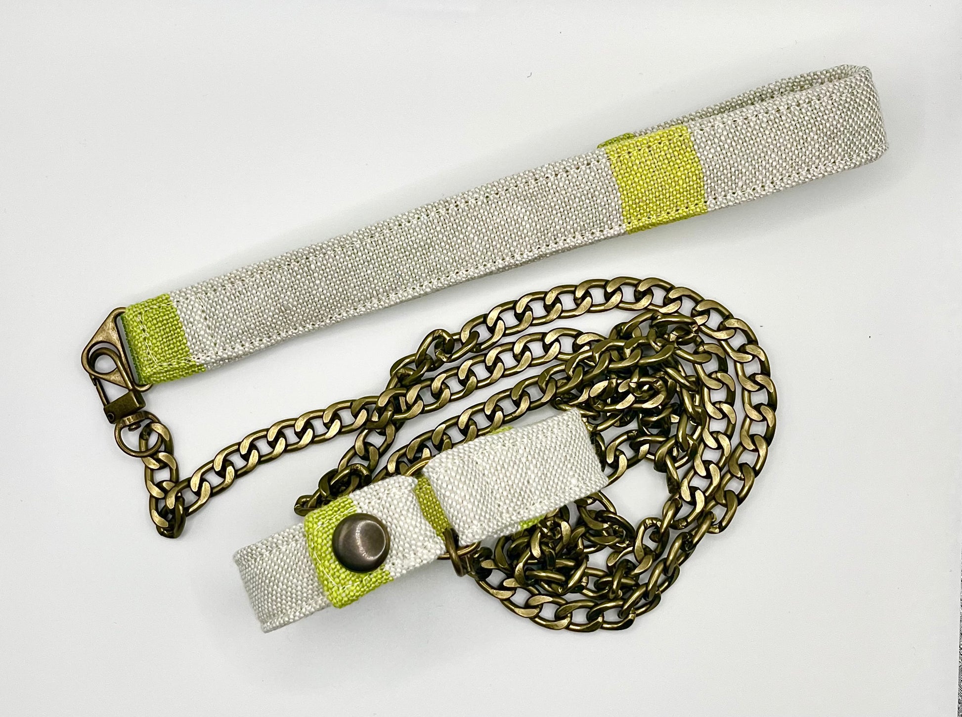 🐾 Guinzaglio coordinato con mamico in lino abbinato al collare e la lunghezza in catena metallica (leggera ma resistente), per una presa sicura e uno stile ricercato.