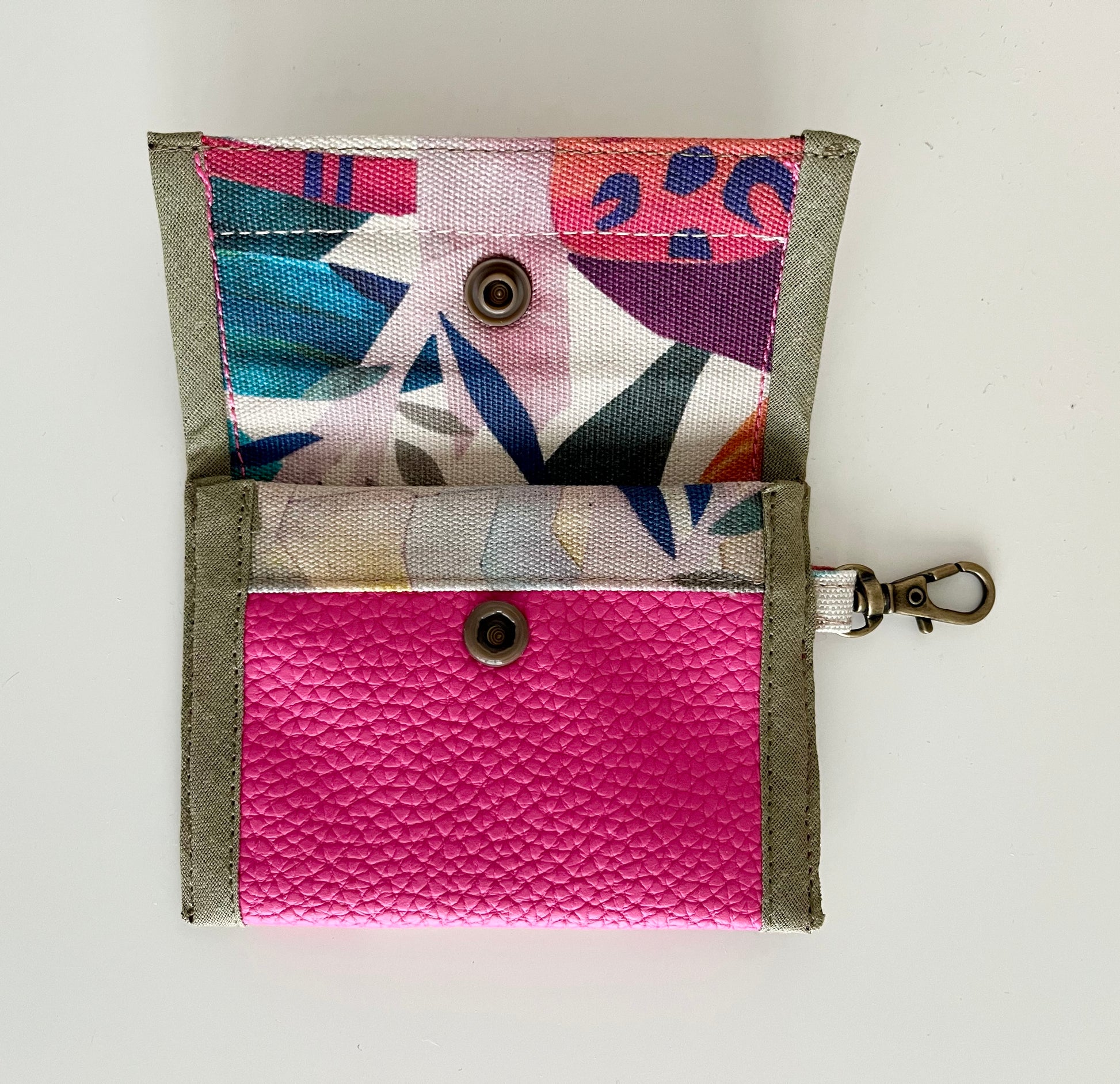 Un set artigianale, grintoso e pieno di personalità. Composto da pettorina, guinzaglio e porta sacchetti in cotone cerato fucsia, con inserti in tessuto geometrico multicolor, turchese e beige. Il porta sacchetti, in similpelle abbinata, completa il look con eleganza. La vera sorpresa? La fodera interna decorata con foglie esotiche e un piccolo leopardo nascosto tra i rami. Un dettaglio originale che racconta stile e fantasia in ogni cucitura. I componenti in metallo bronzato conferiscono carattere e raffinatezza a tutto il set.